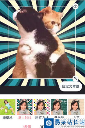 5.點(diǎn)擊右下角的紅色箭頭,進(jìn)入下一步,而這就是我們更換天天P圖摳圖背景的重要部分!在圖片的右下角位置有【自定義背景】的選項(xiàng)。