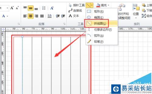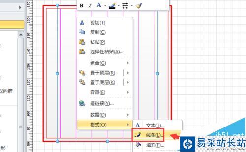 4、點選上方“折線圖”工具,在剛剛繪制的小矩形中間繪制7條豎直線,并點擊鼠標右鍵,選擇“格式”-“線條”選項,將其線條屬性設置為“純紅色,1pt”,如圖所示。