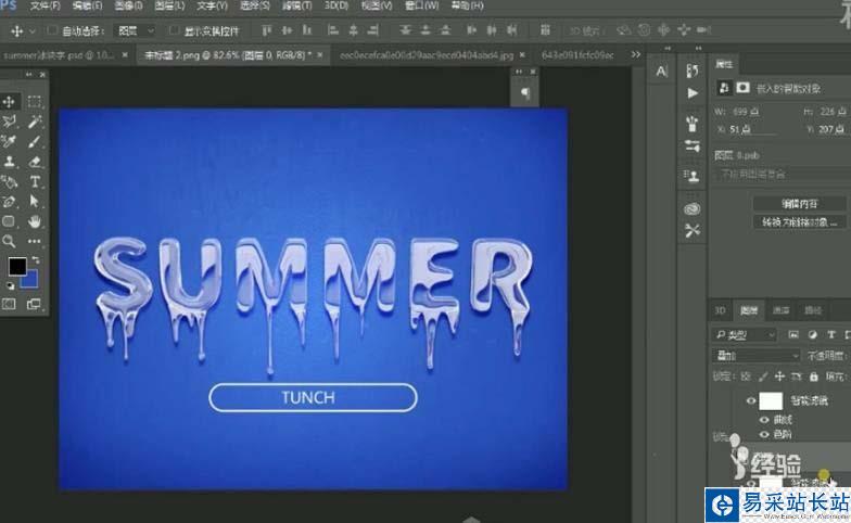9、新建圖層畫筆工具涂抹四角壓暗圖層混合模式疊加,拖入雪素材置于背景層上邊,ctrl+m壓暗,ctrl+u繼續調整,降低不透明度 ,圖層混合模式疊加,拖拽水珠素材模式調成柔光降低透明度,新建圓角矩形調成去掉描邊白色,輸入輔助文字,居中對象ctrl+g成組。