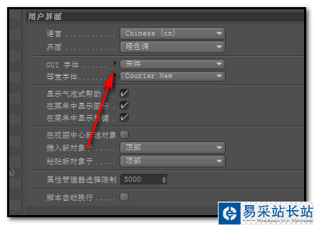 6、在這里,我們沒有直接看到有設置字體大小的按鈕;怎么辦呢,其實啊,是隱藏在里面,在“GUI 字體......"右側這里有一個小三角,大家有發現嗎?
