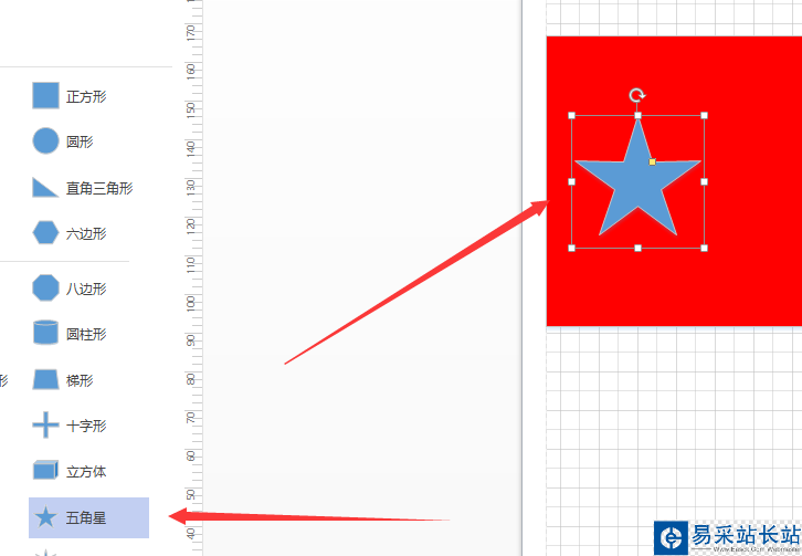 4、從左側(cè)的形狀中找到五角星,拖至中間的制圖區(qū)。