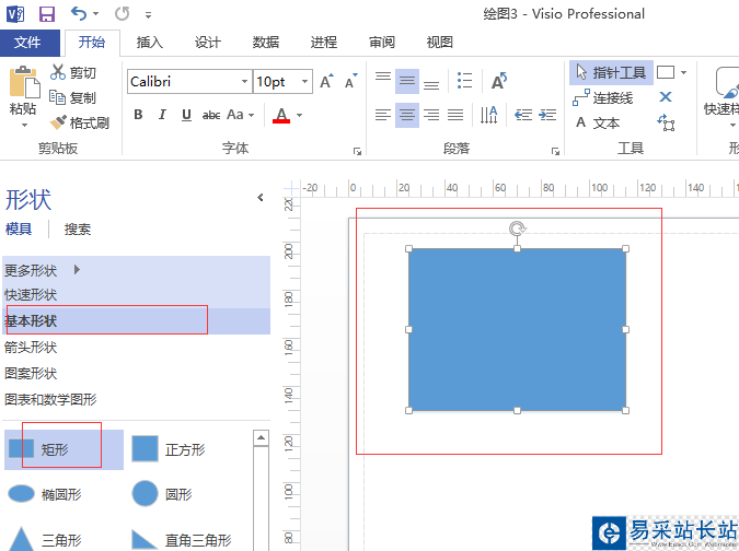 2、在左側(cè)可以看到基本形狀等信息,首先在左側(cè)拖動一個矩形圖到中間的制圖區(qū)。