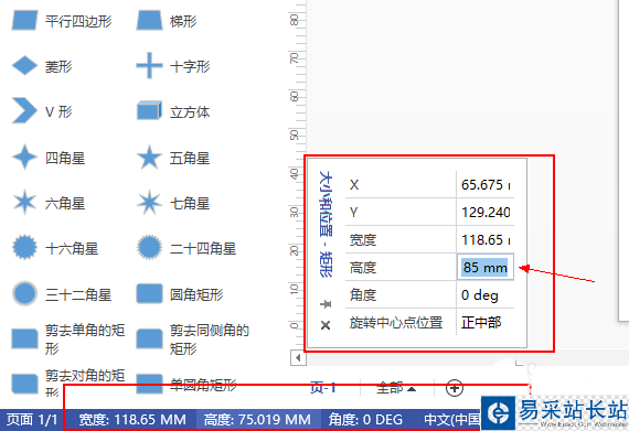 6、在文件的左邊底部有一個狀態(tài)欄,寬度高度和角度都有,點(diǎn)擊一個寬度,跳出一個大小和位置的選項(xiàng)界面,可以輸入自己需要的尺度。