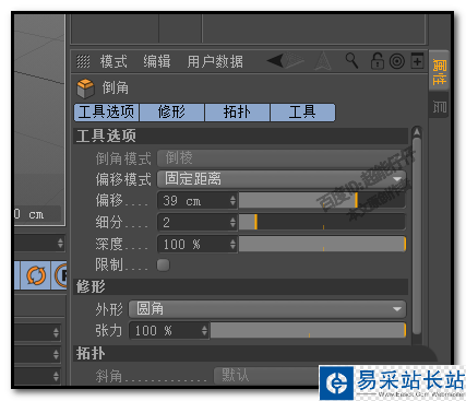 7、在倒角屬性面板這里, 把細分設置為2;鼠標再點住視圖,向右邊拖。使偏移值在39左右。