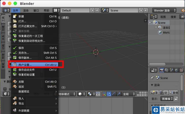 1、打開blender首先“文件”--“用戶配置”。