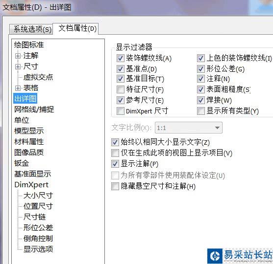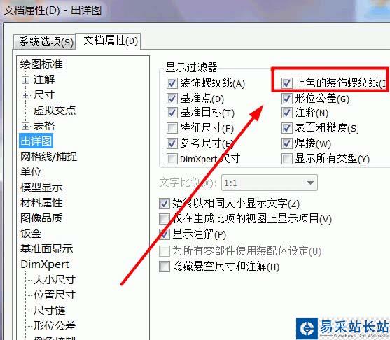 2、solidworks中一般不用拉伸切除的辦法畫螺紋,因為那樣太麻煩。筆者提供一種方法,快速插入螺紋,插入螺紋之前得先把“上色的螺紋裝飾線命令打開”,否則插入了螺紋不會顯示。打開文件菜單“工具”下拉菜單,選擇“選項”,打開“文檔屬性”對話框,如圖所示