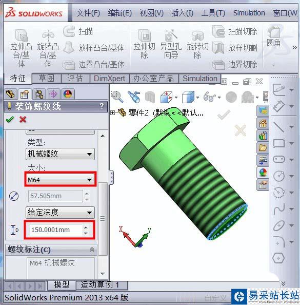 6、再選擇螺紋的大小,我這里以M64的螺紋為例子,輸入螺紋長度為150mm,如圖所示