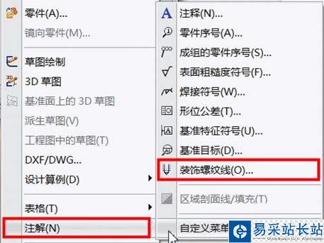 4、確定返回零件模式,在上方文件菜單欄“插入”,“注釋”,“裝飾螺紋線”,如圖所示