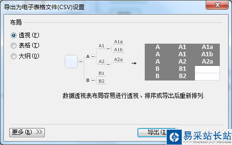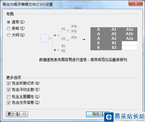 5、單擊界面下方的“更多”按鈕,可展開更多設置選項;用戶可以通過勾選的方式,來決定導出是否包含標題記錄、浮動主題等信息;導出布局有三種形式: