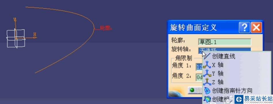 5、退出草繪按鈕,重現點選旋轉按鈕,選擇剛剛繪制的草圖作為輪廓。旋轉軸旋轉與草繪平面平行的按鈕。