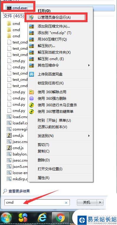 win7的話 在搜索欄輸入cmd右鍵以管理員身份打開