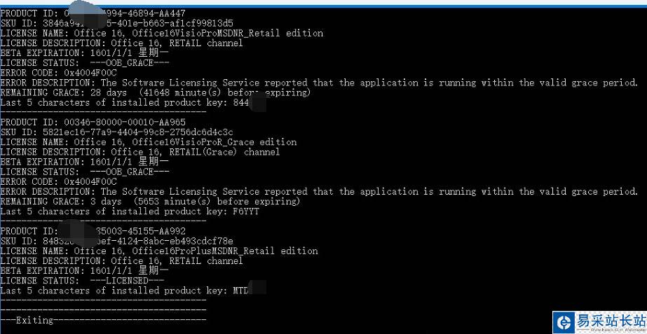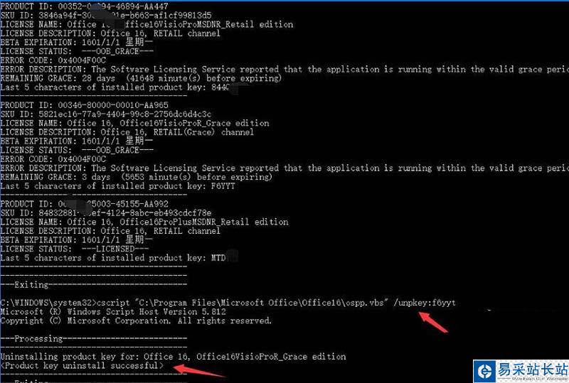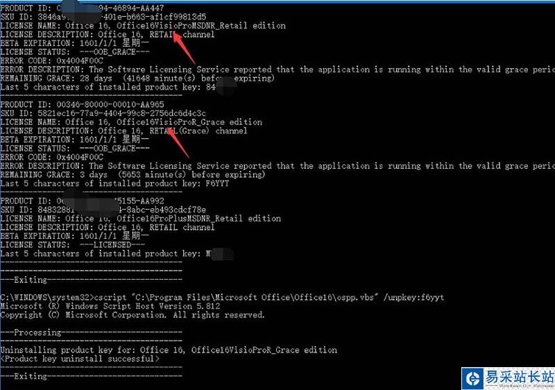 3、首先執(zhí)行成功了命令后,會提示你安裝過了那些密鑰,而且key的位置會顯示密鑰的后5位數; 上面還有對應的產品的版本,如圖中的visio有2個版本,因為裝過破解工具,后面要卸載一個,多了沒用。