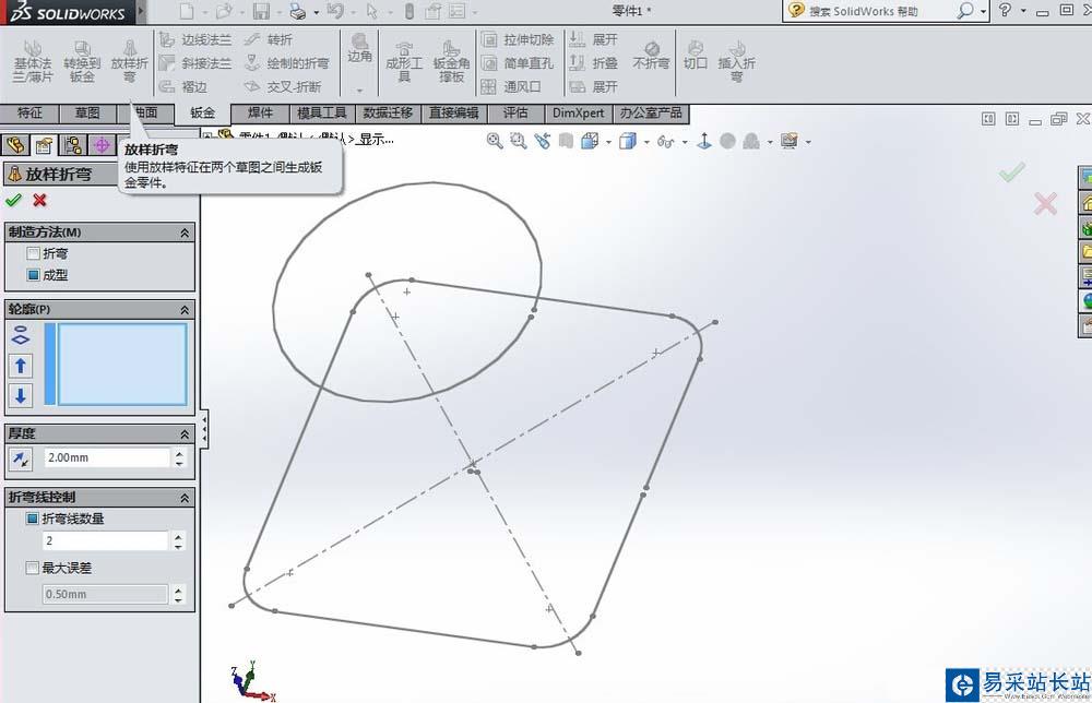 3、點擊【鈑金】-【放樣折彎】,彈出放羊折彎對話窗。