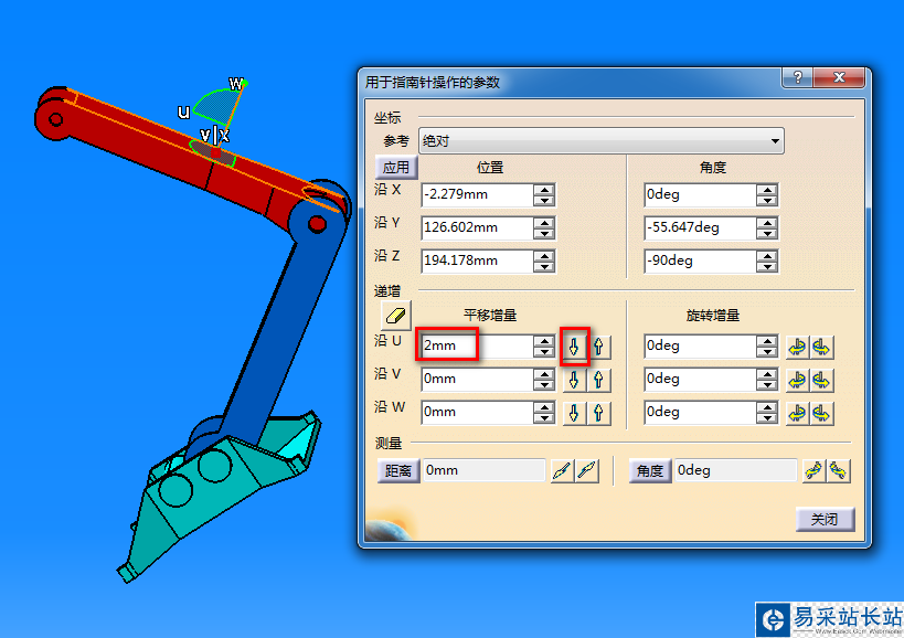 4、如果需要精確移動(dòng)零件,雙擊坐標(biāo)系,彈出對(duì)話框,可以輸入數(shù)值,比如沿U向移動(dòng)2mm,輸入2,再點(diǎn)擊箭頭即可移動(dòng),箭頭向上表示向該軸正方向移動(dòng),箭頭向下表示向該軸反方向移動(dòng);