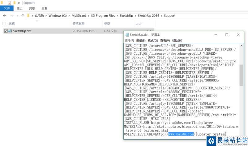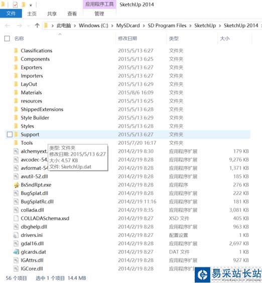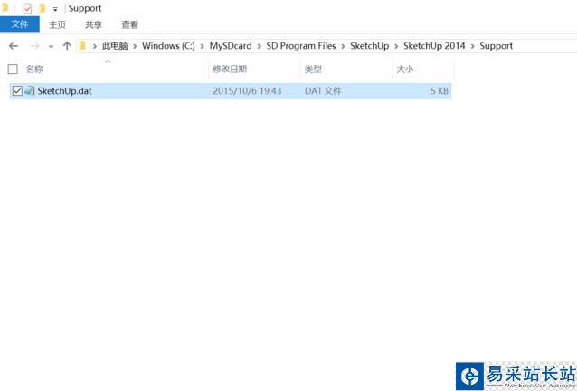 4、雙擊進入“Support”的文件夾,找到名為“SketchUp.dat”的文件。這是一個數(shù)據(jù)文件,如果要編輯的話,可以使用右鍵打開,以文本模式打開。