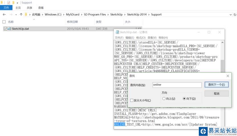 5、直接右鍵編輯“SketchUp.dat”文件,而無須以其他方式打開文件,打開文件后,按Ctrl+F,查找關鍵詞“online”。