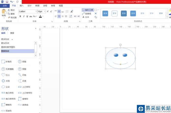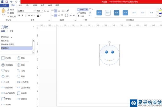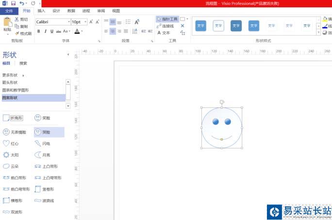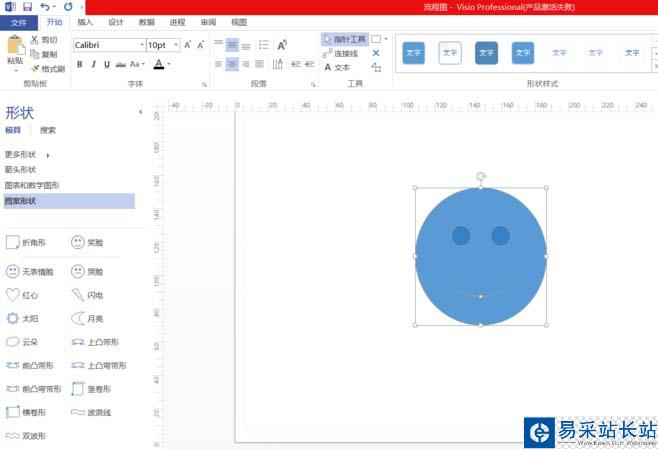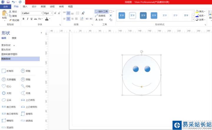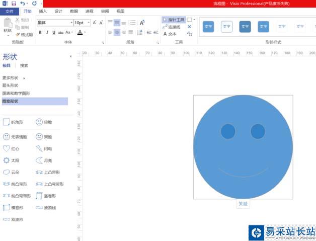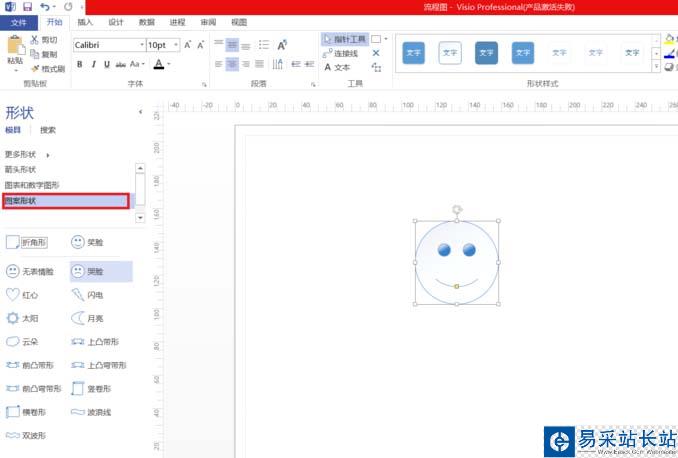 2、編輯圖形:在左側(cè)形狀一欄選擇圖案形狀,選擇笑臉,單擊不放拖動(dòng)至畫(huà)圖界面。
