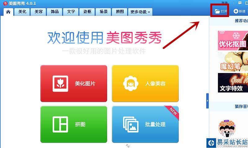 2、在美圖秀秀界面中,點擊打開。出現打開一張圖片選擇框。