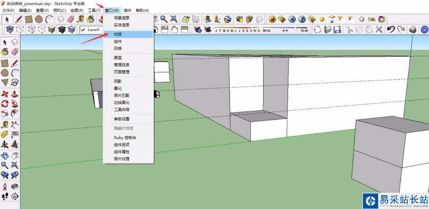 2、進行材質的填充,我們需要首先開啟材質窗口,在SketchUp草圖大師上側的菜單欄中,選擇“窗口——材質”即可開啟材質頁面。