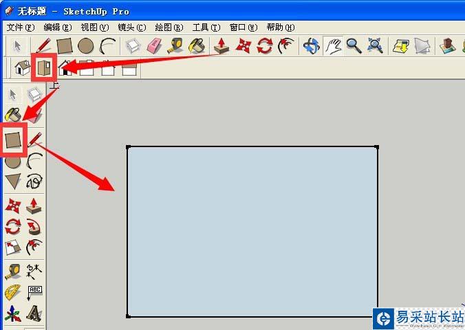 1、打開sketchup8.0在頂視圖下點擊矩形工具,繪制一個矩形,并設置尺寸,效果及步驟如下箭頭所示