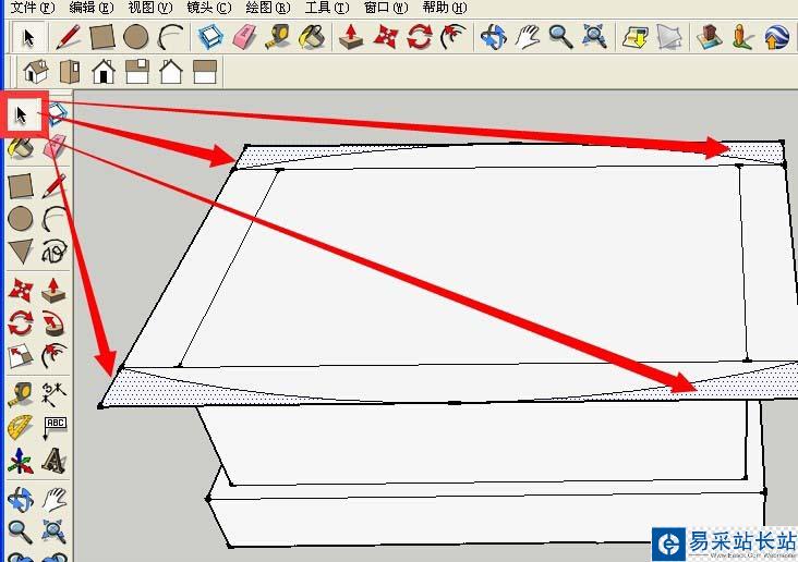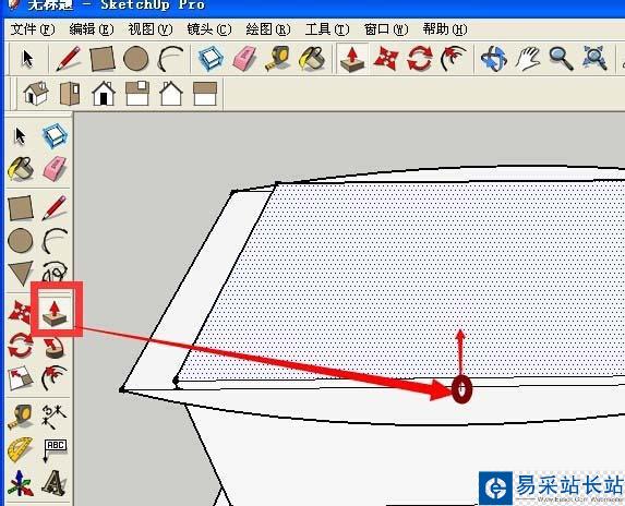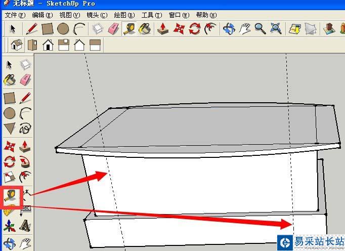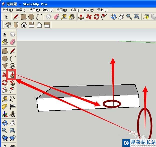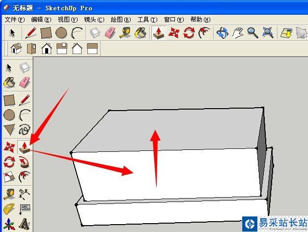 9、刪除后的效果如下,點按推拉工具,再次用推拉工具推拉出一個向上的高度,效果如下所示