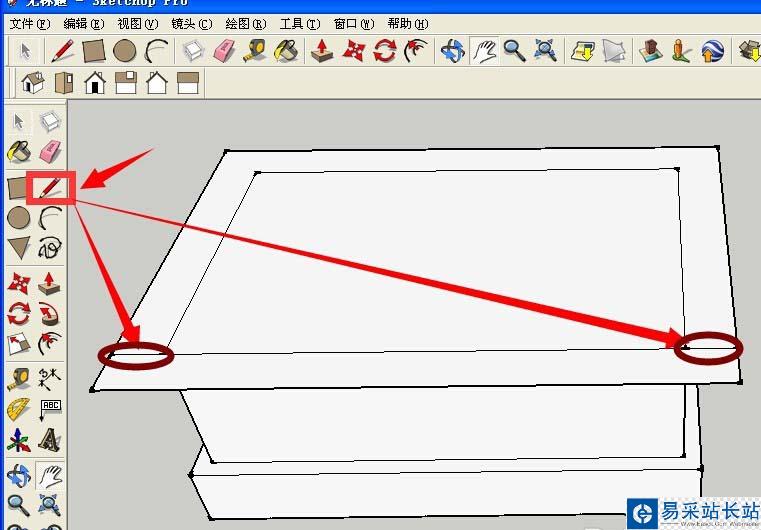 6、用直線工具,為偏移前的一個邊補線,延長至片以后的位置,效果和步驟參見下圖所示