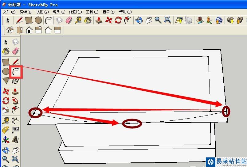 7、用圓弧工具先后點按箭頭所示的兩點,然后在單擊最后一個箭頭所示的位置,形成一個圓弧,效果如下圖所示