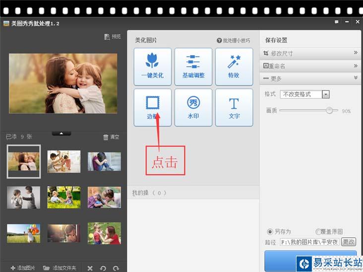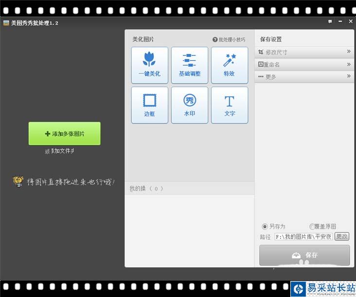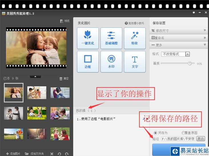8、選擇好了之后,我們在左邊可以看到圖片的效果,中間有個“我的操作”上面會顯示我們對圖片的修改。當我們的邊框修改完成后,點擊保存。保存之前記得選擇路徑。