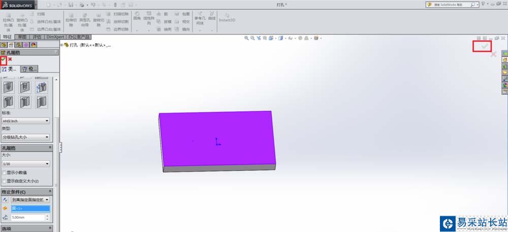 5、孔放置好后退出:孔的放置面設置好后,可移動鼠標,每單擊一次即可在面上放置一個孔,可放置多個。放置完成單擊“√”即可。