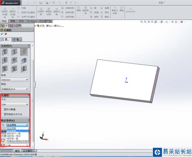 2、異型孔向導:鼠標單擊異型孔向導,界面會自動跳出孔規格選擇欄,根據自己需要選擇孔的類型;如沉頭孔、錐形螺紋孔等。此處選擇孔。