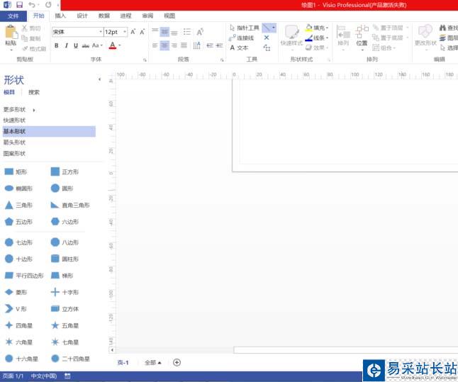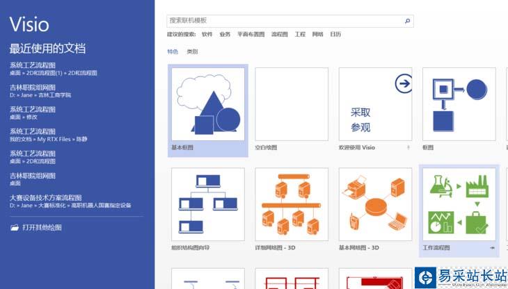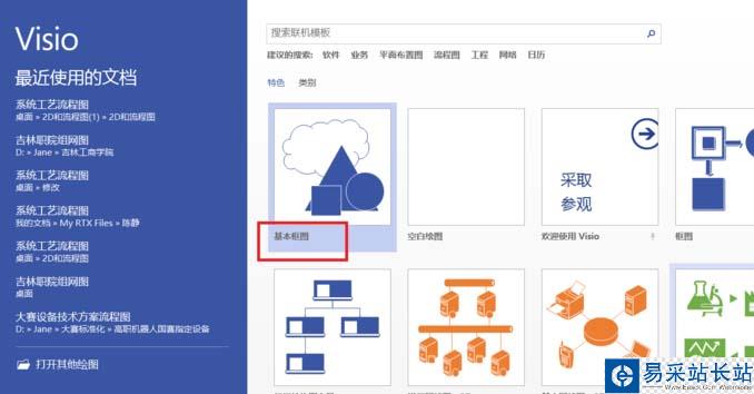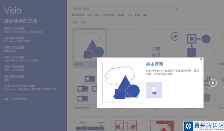 2、新建Visio:運行Visio后進入Visio界面,選擇基本框圖,點擊創建即可進入繪圖界面。