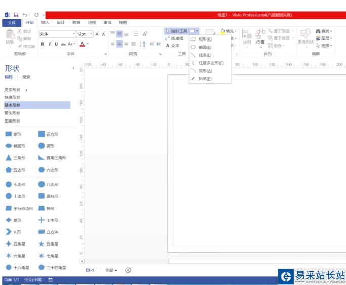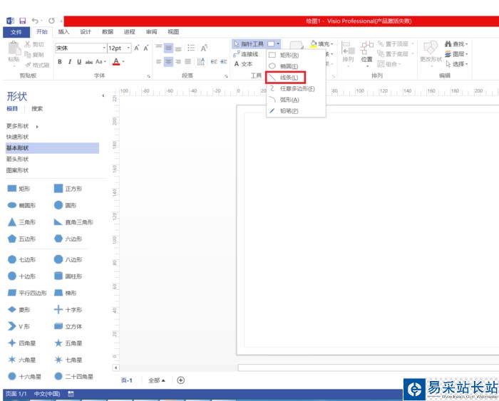3、直線工具:單擊指針工具后的小三角,找到線條并單擊。