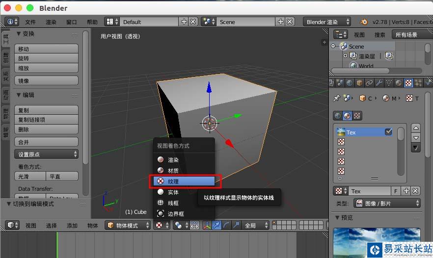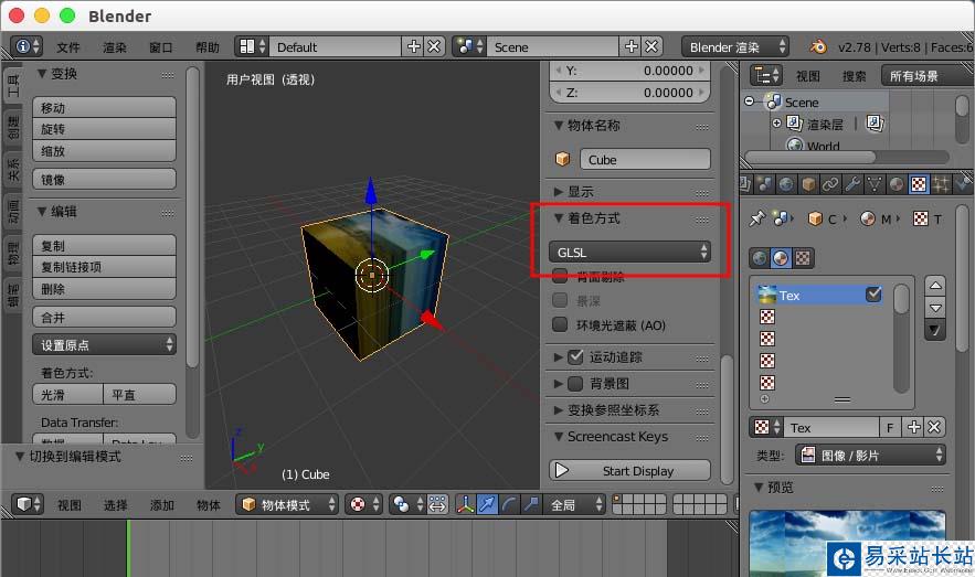 6、在里面找到“著色方式”,修改為“GLSL”實時著色,我們發(fā)現(xiàn)紋理圖片終于顯示了。