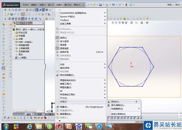 4、點擊菜單欄上“工具”-“關系”-“添加”,即可給草圖添加幾何關系,如下圖
