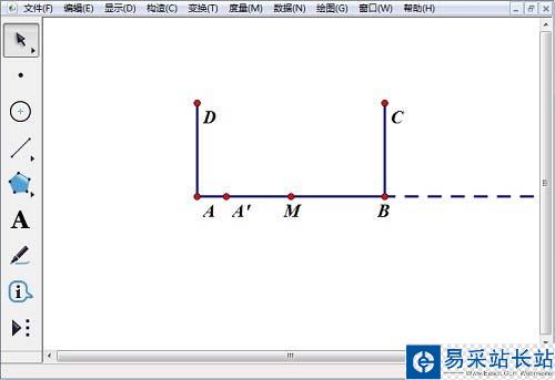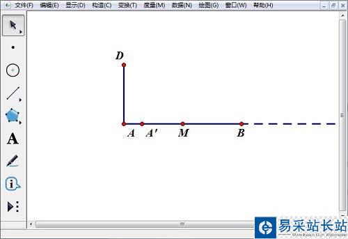 4、構造矩形的頂點和寬。雙擊點A標記中心,選定中點M,“變換”——“旋轉”——“90°”,得到點D。利用線段工具構造線段AD。