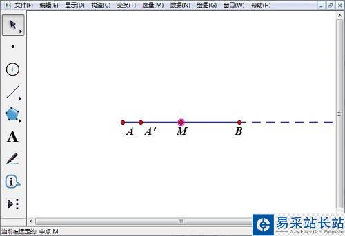 3、構造線段和中點。在射線上任取一點B,利用線段直尺工具連接AB。選定線段AB,單擊“構造”——“中點”(快捷鍵Ctrl+M)。
