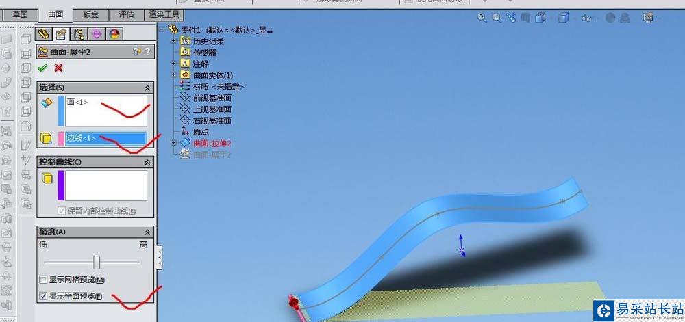 5、選擇需要展開(kāi)的曲面及要從其展平的邊線上的頂點(diǎn)或點(diǎn),預(yù)覽效果并打鉤