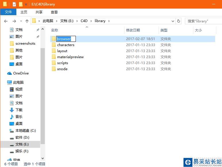 4、打開C4D根目錄,依次點擊X:/C4D/library/browser,小編是安裝在E盤的,所以路徑就是E:/C4D/library/browser,如果沒有browser文件,我們可以新建文件夾,命名為browser。