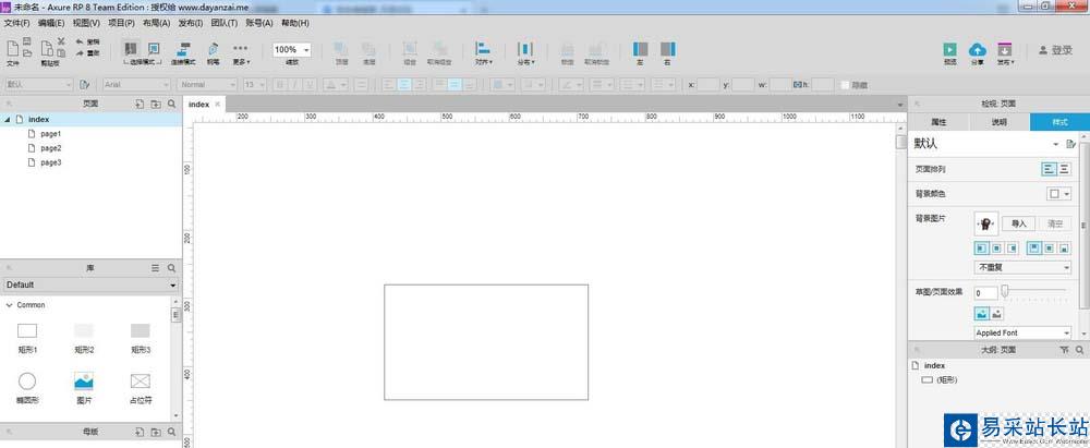 1、在Axure RP8打開新建一個畫布,拖動一個矩形元件到畫布中;