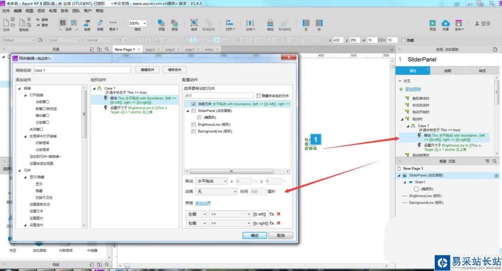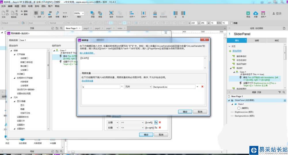 5、在設置動態面板拖動時的交互事件時,需要用到變量,主要用于判斷背景線條的長度和位置,這樣圓形只能在這條線上拖動,如下圖所示。