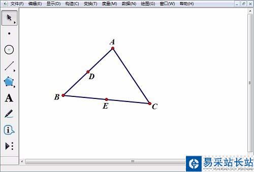 2、依次選擇線段AB、線段BC,執行“構造”—“中點”命令,在線段AB和線段BC分別出現中點D、E。