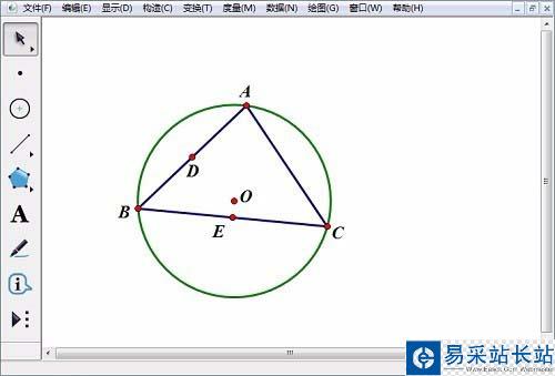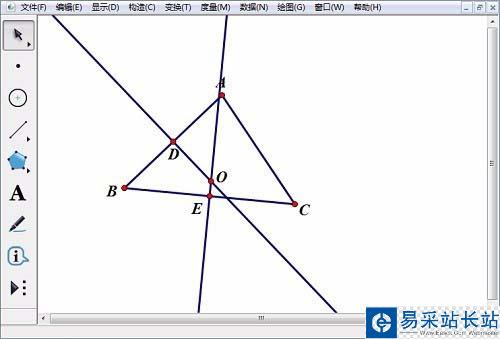 3、選擇線段AB和點D,執行“構造”—“垂線”命令,做出線段AB的垂直平分線。相同的方法構造線段BC過點E的垂線。兩條垂直平分線的交點為“O”。