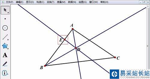 2、構造角平分線。依次選擇點A、B、C,選擇“構造”—“角平分線”命令,作出角ABC的角平分線。相同的方法作出角BAC的角平分線,注意選取點的順序。點擊兩個角平分線的交點,命名為D。
