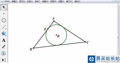 4、繪制三角形內切圓。選中點D和點E,選擇“構造”—“圓心和圓上的點”命令作圓,得到三角形內切圓。選中角ABC的角平分線、角BAC的角平分線和線段AB的垂線并執行隱藏操作,得到如下圖所示圖形。