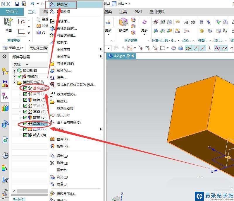 4、然后在界面左側的模型樹欄中,找到草圖和坐標,鼠標右擊它們,然后點擊隱藏按鈕。如圖所示。