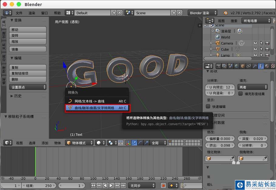 3、選擇“文本”,然后“alt+c”選擇“曲線/融球/曲面/文字轉網格”。