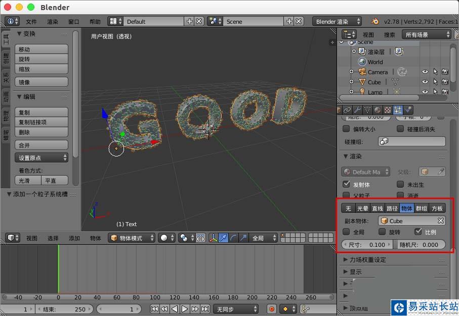 6、在“渲染”中選擇“物體”,副本物體選擇“Cube”,設置尺寸隨機尺寸。