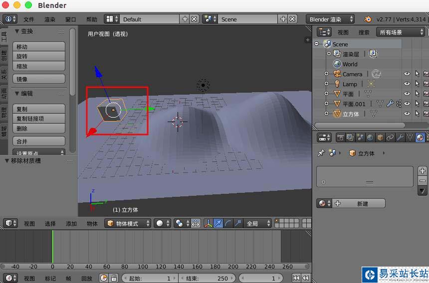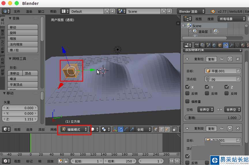 9、選擇“立方體”進入“編輯模式”,把立方體移動到貼著地面的位置。
