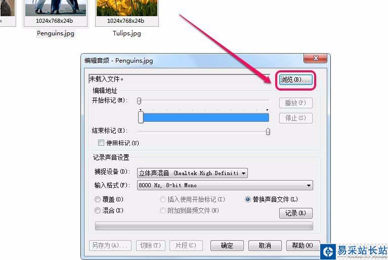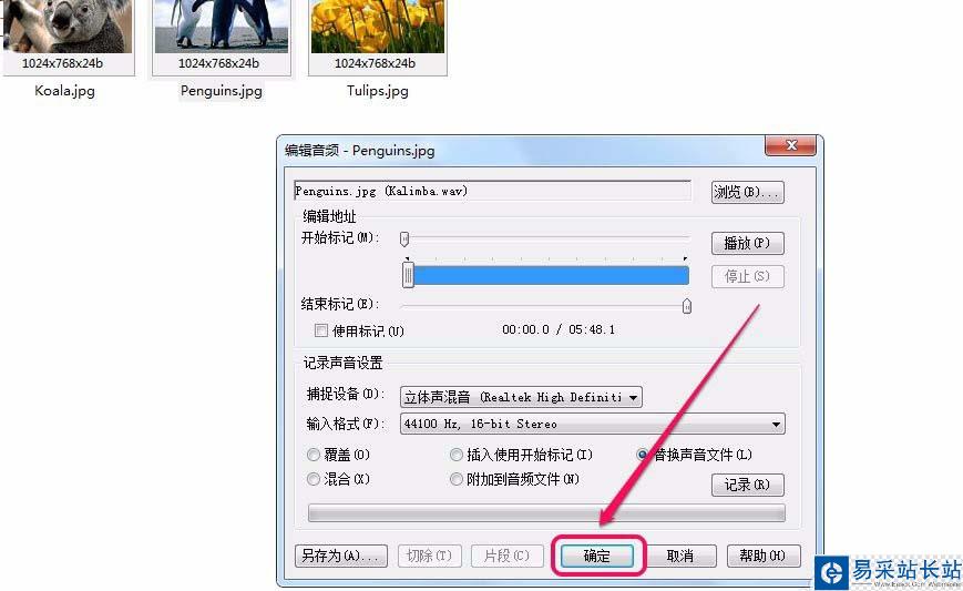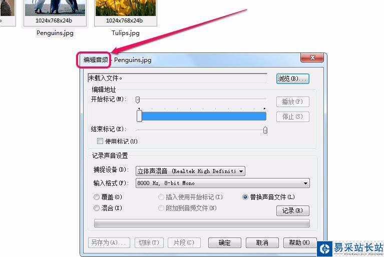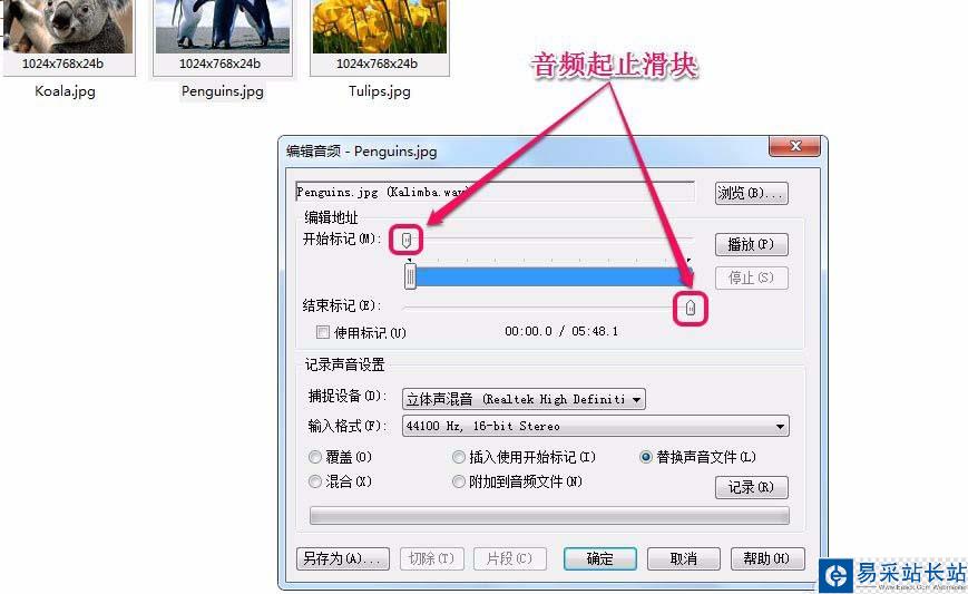 7、圖中紅色框中的是“開始標(biāo)記”和“結(jié)束標(biāo)記”,可以對音頻素材進(jìn)行截取操作。