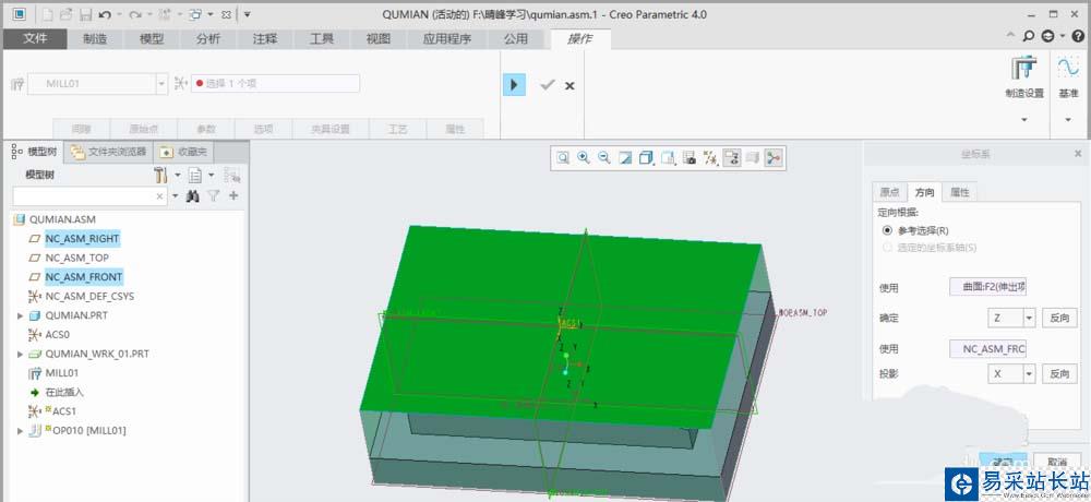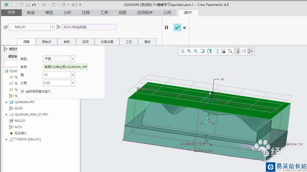 1、打開creo4.0軟件,創建一個數控編程文件。引入參考模型及創建工件。